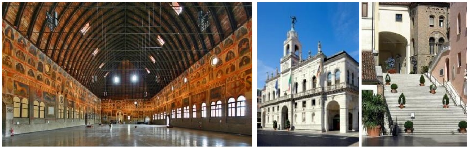 The main internal room of Palazzo della Ragione is 82 meters long and 27 meters wide. It was the ancient seat of the civic courthouses of Padua. Palazzo della Ragione, with its great hall on the upper floor, is reputed to have the largest roof, unsupported by columns, in all of Europe. Construction of the Palazzo was begun in 1172 and was finished in 1219. In 1306 Fra Giovanni, an Augustinian friar, covered the whole building with one roof. Originally there were three roofs, spanning the three chambers into which the hall was at first divided; the internal partition walls remained until the fire of 1420, when the Venetian architects who undertook the restoration removed them, merging all three spaces into one and forming the present great hall “Salone”. The new space was refrescoed by Nicolo' Miretto and Stefano da Ferrara, working from 1425 to 1440. Beneath the great hall, there is a centuries-old market. The entrance to the main room will be through the Palazzo Moroni courtyard and monumental stairs (via VIII Febbraio, see pictures above on the right).