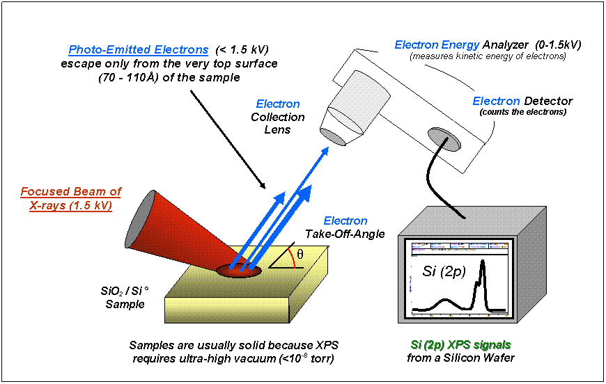 X-ray photoelectron spectroscopy (XPS) is a quantitative spectroscopic technique that measures the elemental composition, chemical state and electronic state of the elements that exist within a material. XPS spectra are obtained by irradiating a material with a beam of X-rays while simultaneously measuring the kinetic energy and number of electrons that escape from the top 1 to 10 nm of the material being analyzed. XPS requires ultra high vacuum (UHV) conditions.